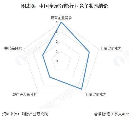 按照以上阐明,对各方面的竞赛处境举办量化,5代外最大,0代外最小,全屋智能行业的竞赛处境如下图所示:
